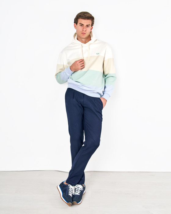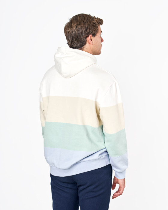 Esta sudadera de estilo oversize es una prenda moderna y muy confortable. Confeccionada en punto de felpa (80% algodón, 20% poliéster), te ofrece calidez y un tacto suave. El diseño color block con franjas horizontales de tonos a contraste le aporta un aire actual y desenfadado. Incorpora capucha ajustable y puños elásticos. Un pequeño logo bordado en el pecho es el detalle distintivo. Ideal para