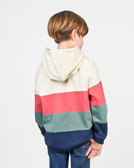 Comodidad y Tendencia Color Block. Sudadera con capucha para niño, confeccionada en punto felpa (80% algodón y 20% poliéster). Su diseño oversize a rayas de color block es llamativo y moderno. Ofrece un ajuste relajado, ideal para jugar, y la combinación perfecta de sport y estilo casual.