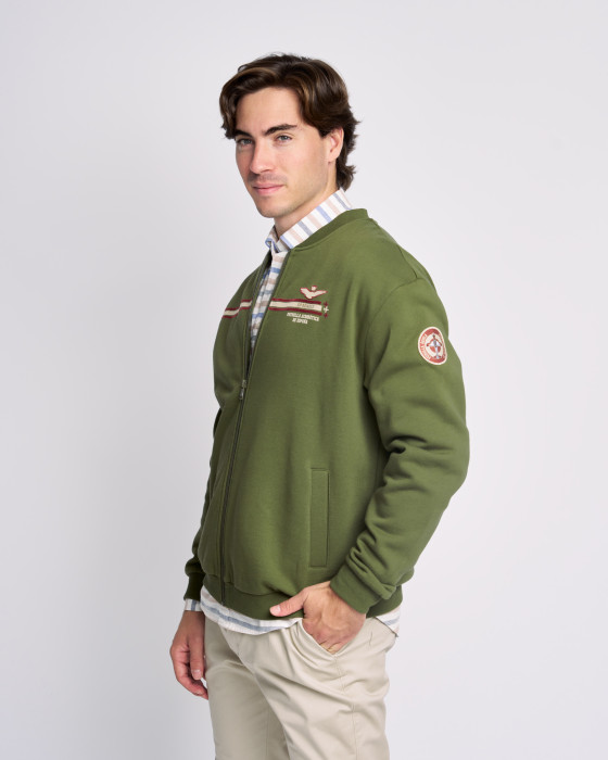Sudadera de cremallera en punto felpa de alta calidad ($80\%$ algodón). Diseño estilo bomber con cuello, puños y bajo acanalados a contraste. Parches inspirados en la Patrulla Acrobática. Una prenda cómoda y con personalidad para un look casual.